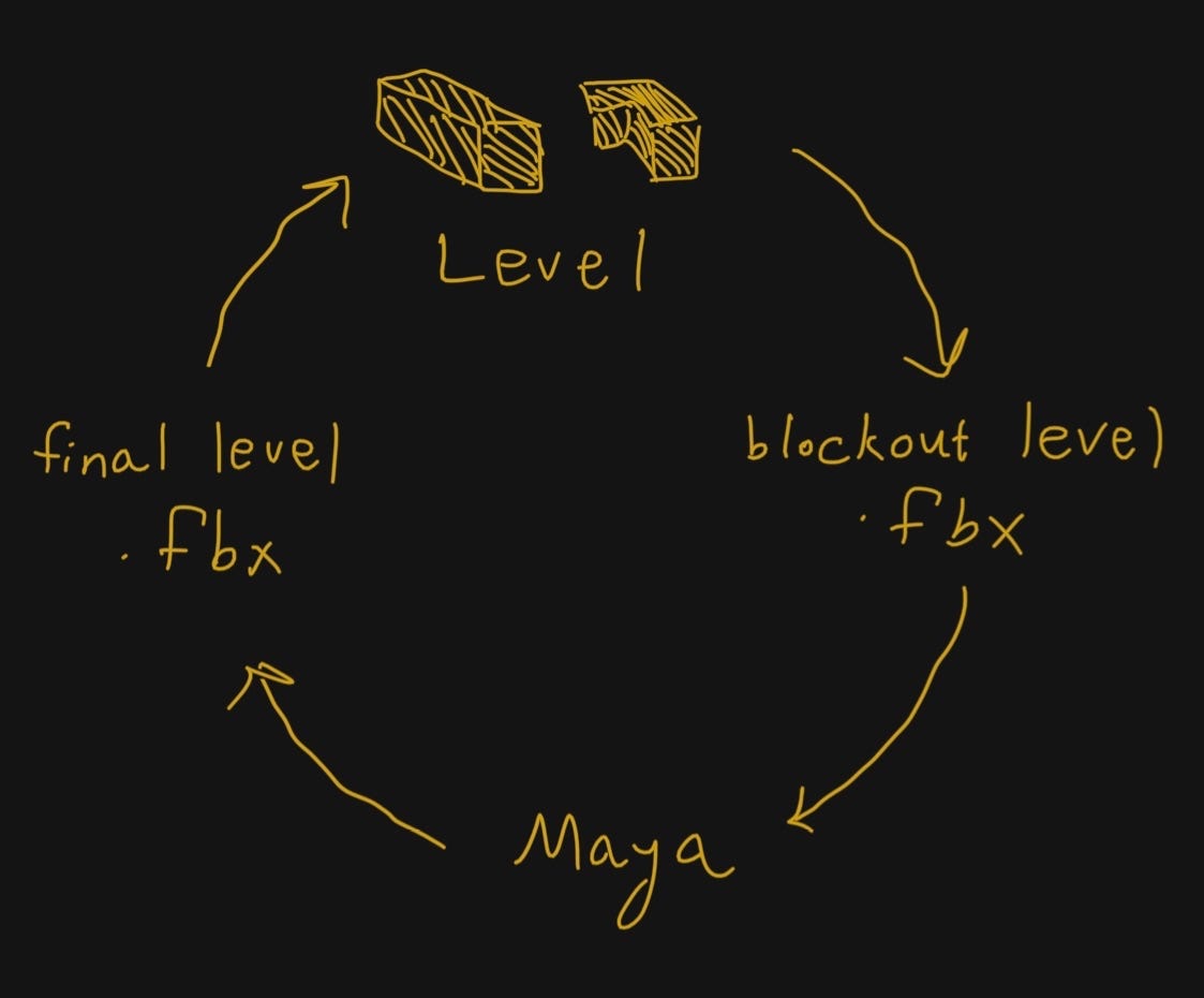 The pipeline we came up with was to make a block-out version of the levels inside of the level editor with cubes and placeholder models. Then export them out as FBX files so that the artists could load them up inside of Maya and make them pretty. Then we would reimport their work into the levels.